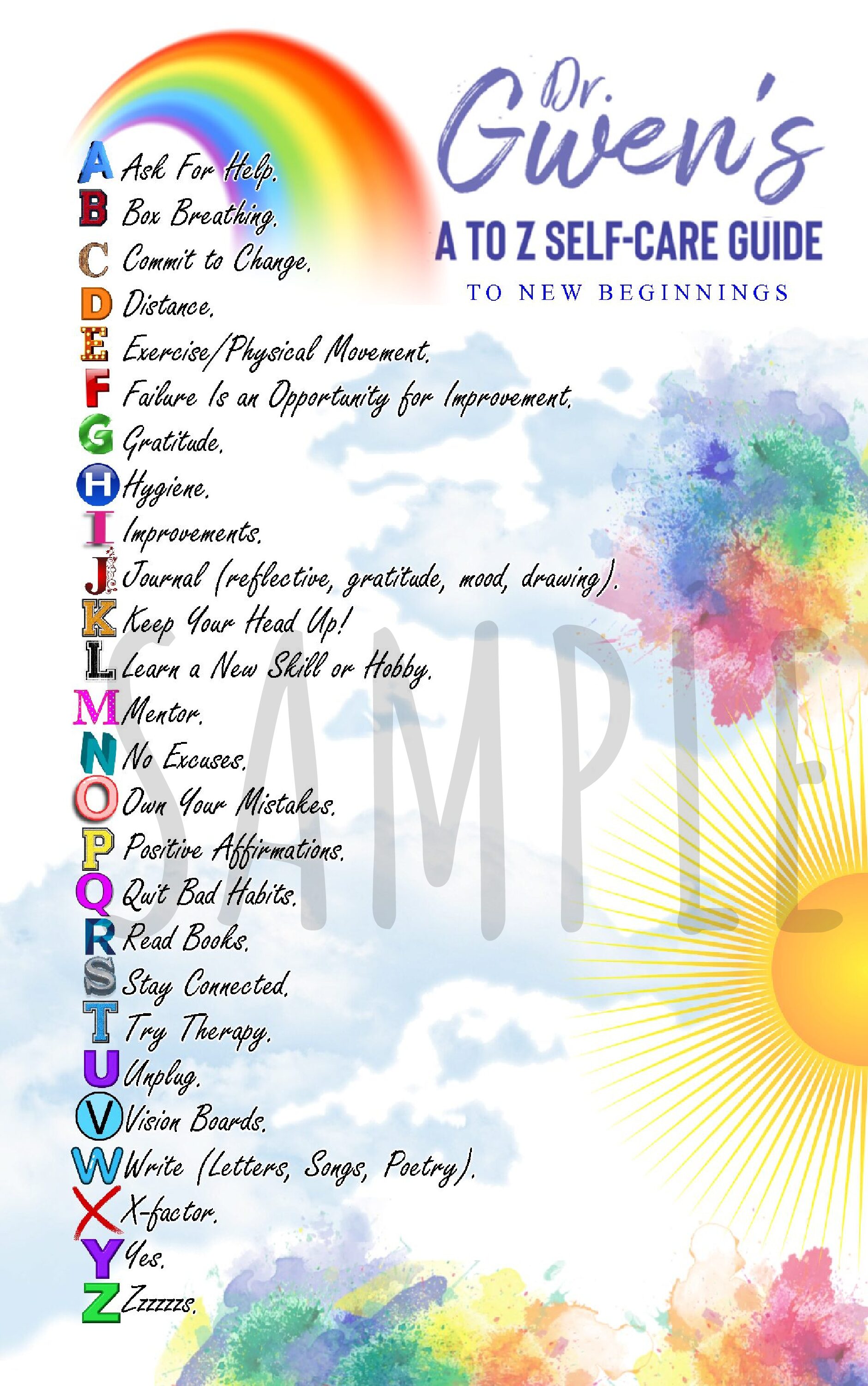 Dr. Gwen’s Educator A to Z Self-Care Poster is a vibrant 11.5 X 17 glossy poster. It contains 26 self-care ideas to include: A- asking for help, L- learning a new skill or hobby, and N- “No!” Say it, mean it, and don’t feel guilty about it and much more. These ideas help to renew and re-energize your mind, body, and spirit personally and professionally.